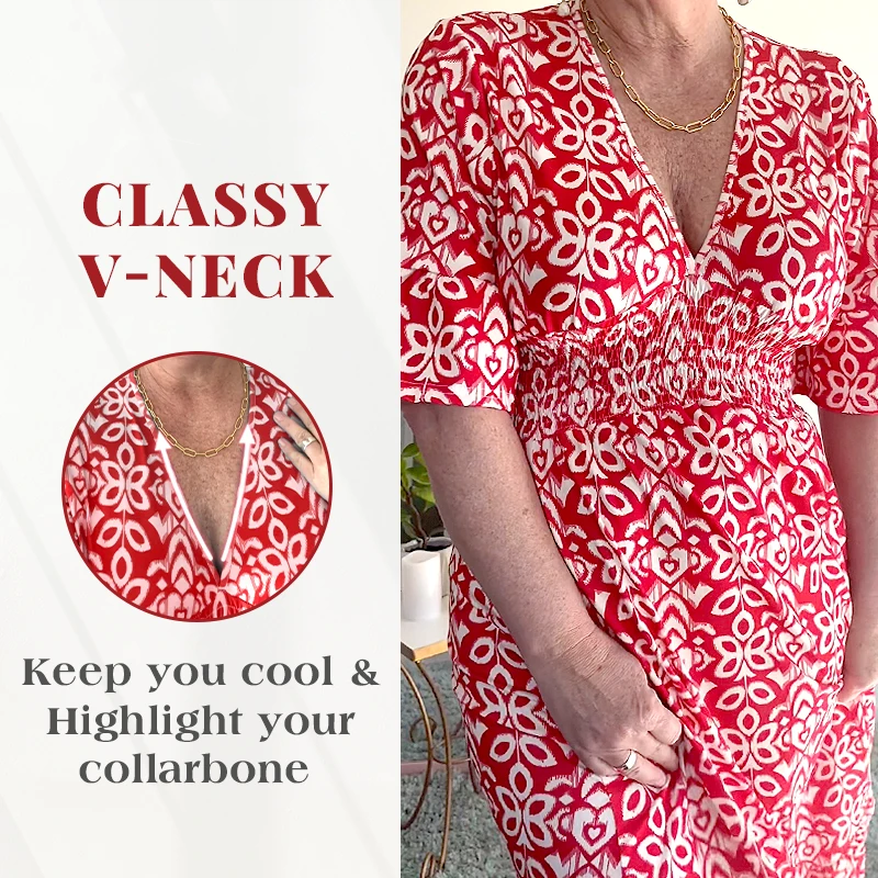 Designed with a V-neckline and a relaxed bust, this dress offers a comfortable and flattering fit. The lightweight fabric adds to its airy feel, making it your go-to choice for breezy days and nights.